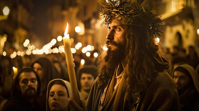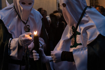 Closeup of the hands of a nazarene penitent during a nocturnal procession holding his candle. Holy Week of Seville, Andalusia, Spain