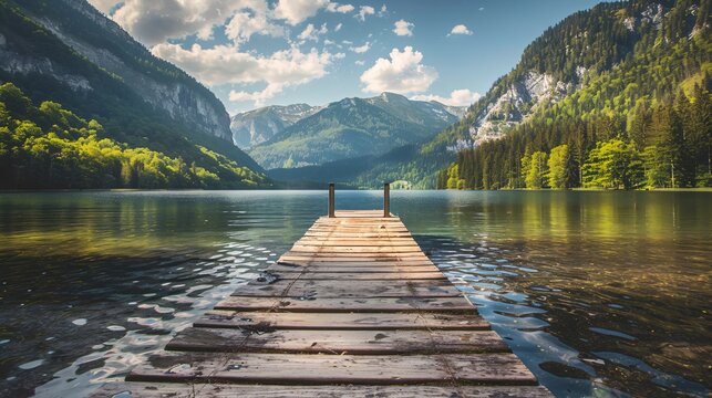 Wooden dock on the lake surrounded by a beautiful mountains, Generative AI