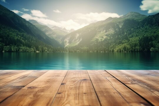 Serene lake view with wooden dock and mountain backdrop. Nature background.