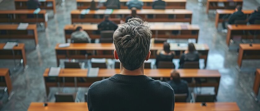 A student sitting in a nearly empty lecture hall.