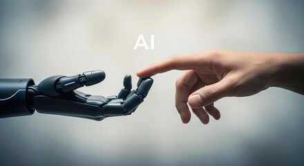Robot hand and human hand nearly touching with the text "AI" above.