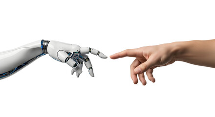 Human and robotic hands nearly touching, symbolizing artificial intelligence, future technology, and the evolving connection between humanity and advanced machines