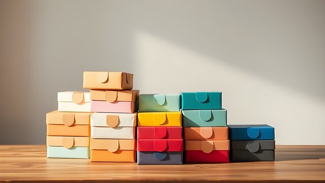 Colorful package boxes neatly stacked on a wooden table, showcasing modern packaging design.