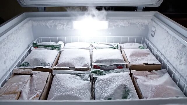 Open deep freezer reveals cavern of white frost, packages stacked neatly.