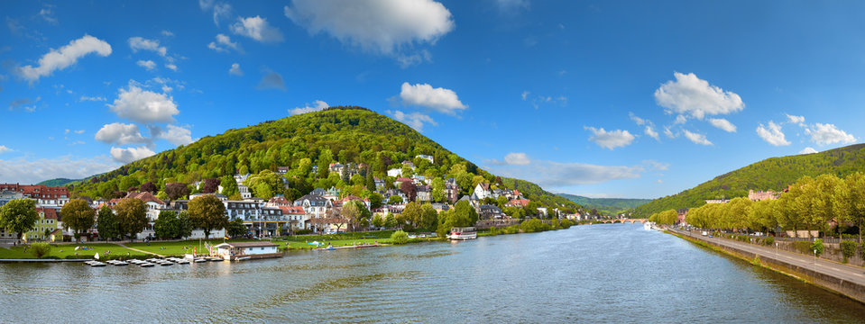 Panoramic view of Heidelberg and Neckar river from Karl Theodor Bridge