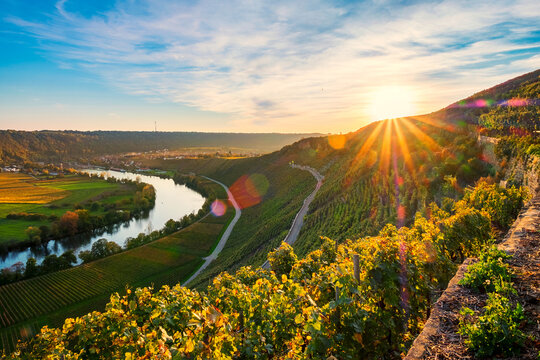 Lake Max-eyth-see and river neckar viewpoint at sunrise with purple sky, vineyard, sun, stuttgart before sunrise