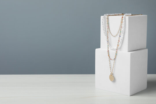 Stylish presentation of necklaces on podiums on white wooden table, space for text