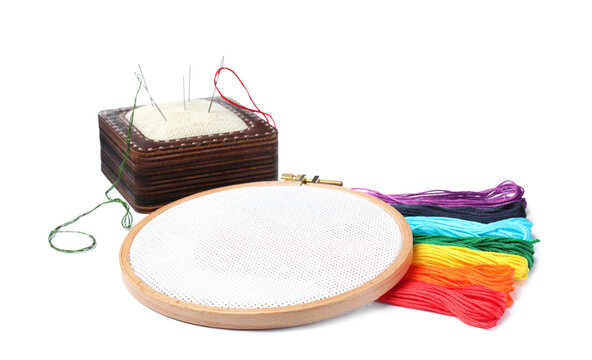 Skeins of Thread and Needles in Bowl. Knighting colorful woolen string balls in basket. Needlecraft icon symbol. Flat vector illustration