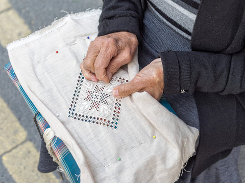 Woman lace-maker sits with needlework on knees and embroiders. Pano Lefkara, Cyprus.