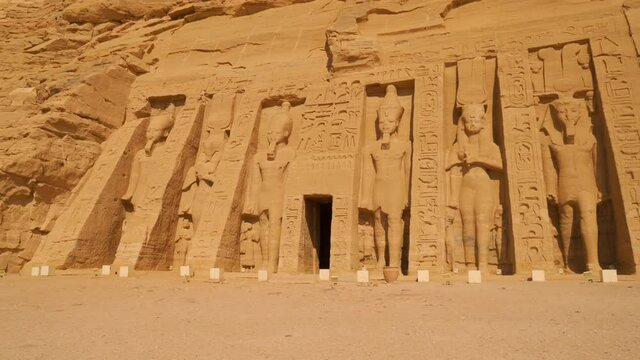 Beautiful setting of the temple of nefertari next to the temple of Abu Simbel, in southern Egypt in Nubia next to Lake Nasser. Temple of Pharaoh Ramses II, 4k video