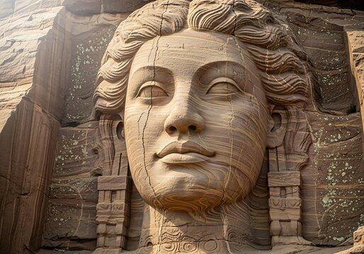Closeup of a weathered ancient egyptian colossal statues face carved into rock