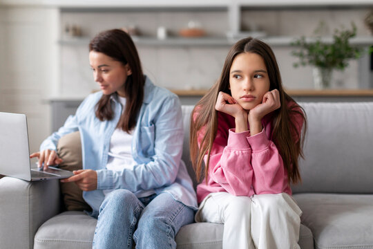 No time for child. Mother working on laptop, sitting on sofa with offended teen daughter nearby, woman ignoring her child feeling neglected by her mommy