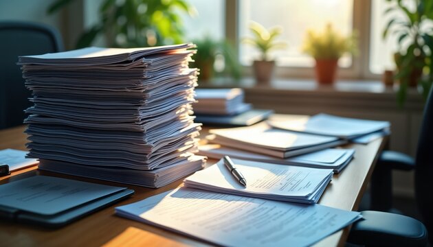 High pile of documents fills office desk. Unattended paperwork suggests overwhelmed customer service. Disorganized papers symbolize neglected customer complaints. Unresolved issues create mountain of