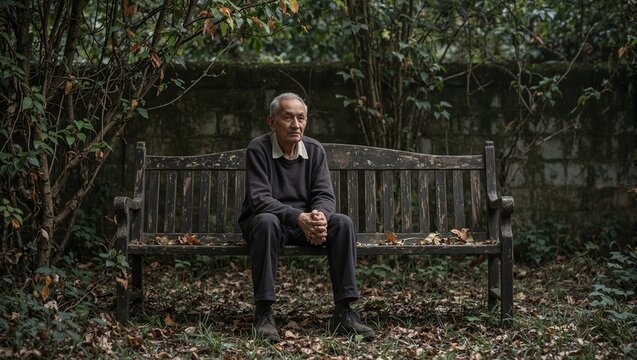 A poignant image of a senior man on a weathered bench in a neglected garden surrounded by overgrown vines and fallen leaves capturing solitude and reflection
