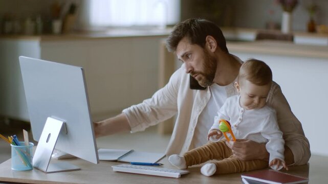 A father multitasks as he works on his computer in a cozy kitchen. He holds his baby close while talking on the phone, showcasing family life and balance during a workday at home.