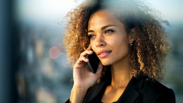 Businesswoman with curly hair using smartphone near office window with blurred cityscape in background, enjoying a moment of reflection during her workday