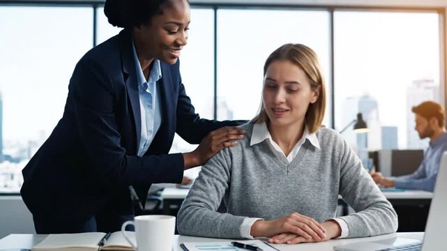 Supportive coworker offers reassurance, empathy, and encouragement to a stressed colleague during a workday in an office setting