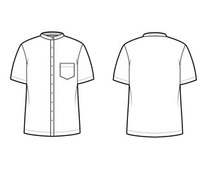 Shirt nehru collar technical fashion illustration with short sleeves, angled pocket, mandarin neck. Flat indian jacket apparel outwear template front, back, white color. Women men unisex CAD mockup