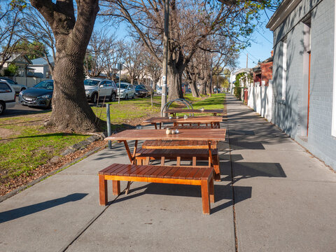 Outdoor dining tables and benches on the footpath outside a corner café in a quiet suburban street in Footscray, Melbourne, Australia. A relaxed atmosphere of local neighborhood and community life.