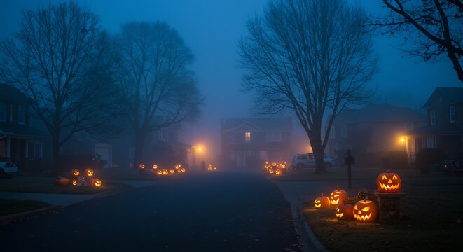 Foggy street lined with glowing jackolanterns in a suburban neighborhood at dusk