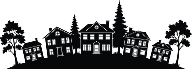 Suburban neighborhood silhouette houses, residential street landscape, black home skyline illustration, family housing concept isolated on white background