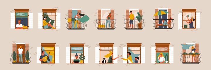 Friendly relationship with neighbours. Young family talking to elderly couple near fence outdoors