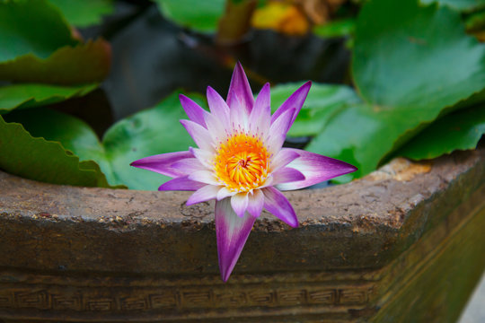 white and purple water Lily flower in a large ceramic vase on the territory of a Buddhist monastery