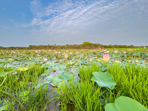 Sacred lotus (Nelumbo nucifera), at sunrise in Kampong Tralach, Cambodia, Indochina, Southeast Asia, Asia