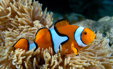 Detailed underwater wildlife image highlighting symbiosis between clownfish and anemone.