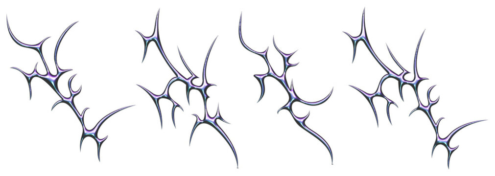 Neo tribal tattoo style shapes. Cyber sigilism spikes and sparks for streetwear print designs, spiky y2k aesthetic vector set