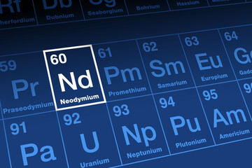 Neodymium, on periodic table. Rare earth metal in lanthanide series, with atomic number 60 and element symbol Nd, from Greek neos didymos, meaning new twin. Used for lasers and high strength magnets.