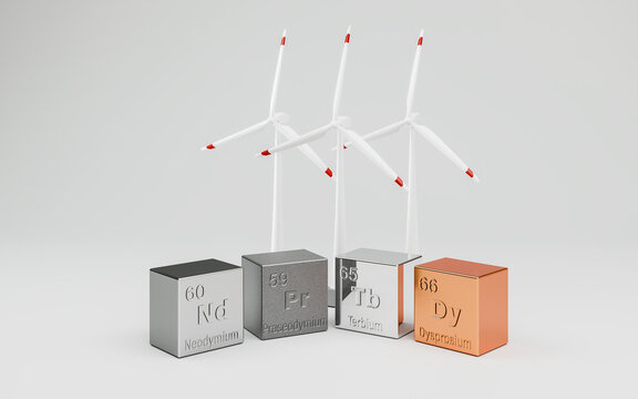 Rare Earths concept: Elements which are used for wind turbines, permanent magnets  and electric motors. Cubes representing Neodymium, Praseodymium, Terbium and Dysprosium in front of wind turbines.