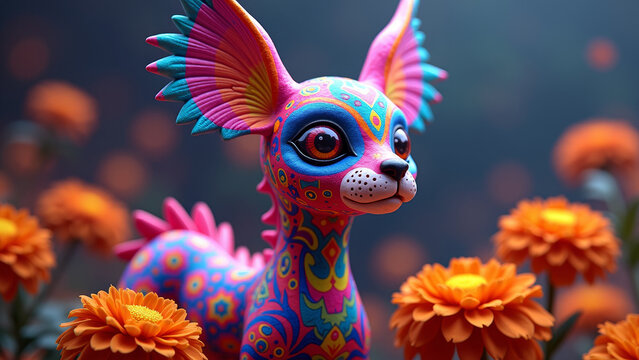 Colorful alebrije creature glowing with neon Mexican folk art fantasy Día de los Muertos digital artwork vibrant design