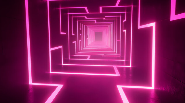 Abstract maze of neon laser lines reflecting in a mirrored structure