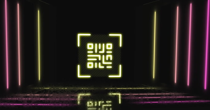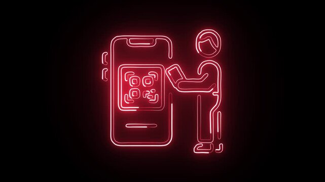 Glowing neon light animated barcode or qr code scanner, QR code scanner animation, QR code animation, Scan qr code icon with laser, neon barcode scanner animation on black background
