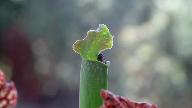 Fly getting tempted and trapped inside sarracenia, trumpet pitchers plant.