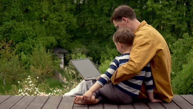 Uncle and nephew sitting together on terrace in garden with laptop computer, Wroclaw, Poland