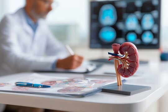 Close-up of anatomical kidney model on a doctor's desk with medical documents and a blurred doctor in the background, concept for medical education, health awareness campaign, and nephrology