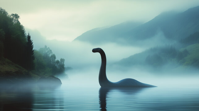 The loch ness monster swimming in the early morning mist