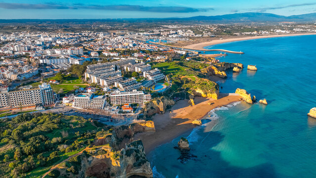Aerial view of golden sands meet turquoise waters, cliffs rise dramatically, and buildings nestle along the coastline, Lagos, Faro, Algarve, Portugal.