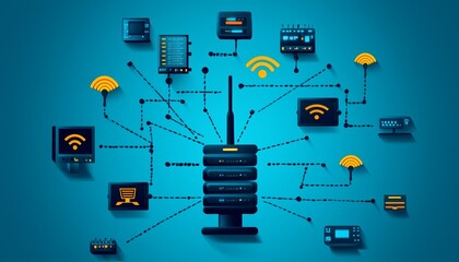 A flat design showing a telecommunications network diagram, with connections between different types of devices and servers