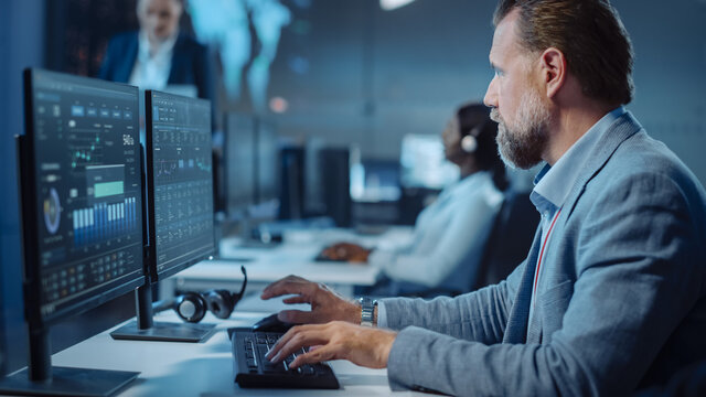 Portrait of Serious Professional Technical Controller Sitting at His Desk with Multiple Computer Displays Before Him. In the Background His Colleagues Working in System Control and Monitoring Center.