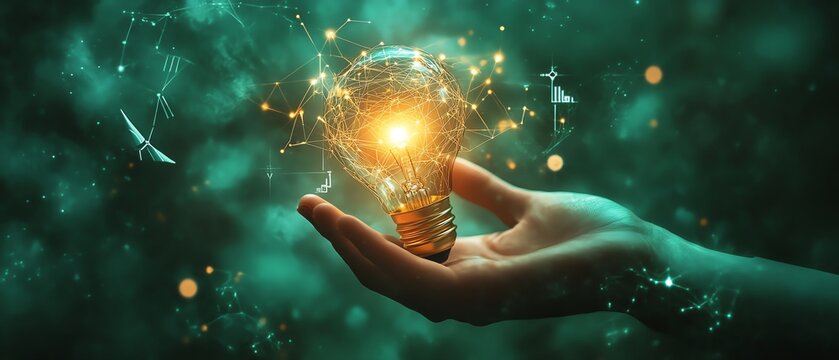 A hand holding a glowing light bulb, with network connections and environmental icons like wind turbines and solar panels overlaid on a green background, ultrarealistic, 8K detail