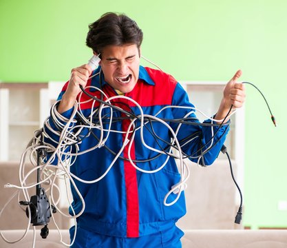 Frustrated woman with router issues holding tablet, laptop and head in hand