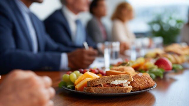 Executive boardroom lunch featuring artisanal sandwich platters and fresh fruit arrangements on polished conference table with business professionals engaged in strategic