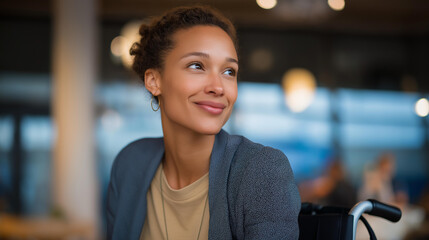 A professional in wheelchair participates in a networking event, confidently exchanging ideas with fellow attendees, promoting connections, inclusivity, and diversity within the business community.