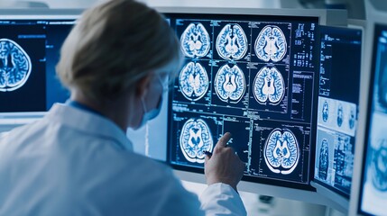 Advanced medical imaging technology in neon blue showcasing a series of brain MRI scans for neurological research and diagnostics in a clinical setting