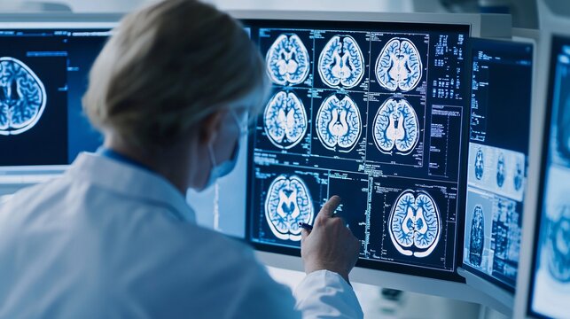 Neurologist examining a 3D holographic brain scan to identify and diagnose neurological disorders Stock Photo with copy space