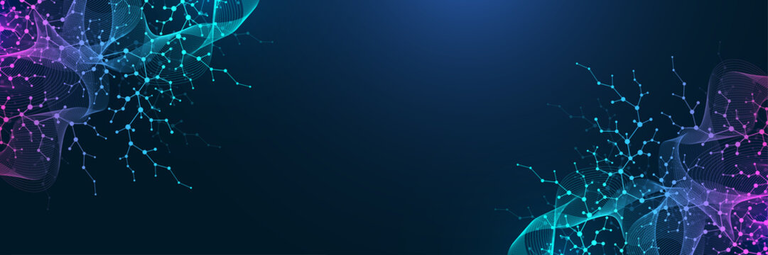 Molecular structure background. Science template wallpaper or banner with a DNA molecules. Asbtract molecule background with hexagons, wave flow, illustration.