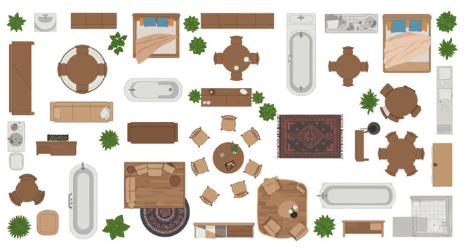 top-down view of furniture arrangement showing interior design plans in neutral colors useful for architectural visualization and space planning